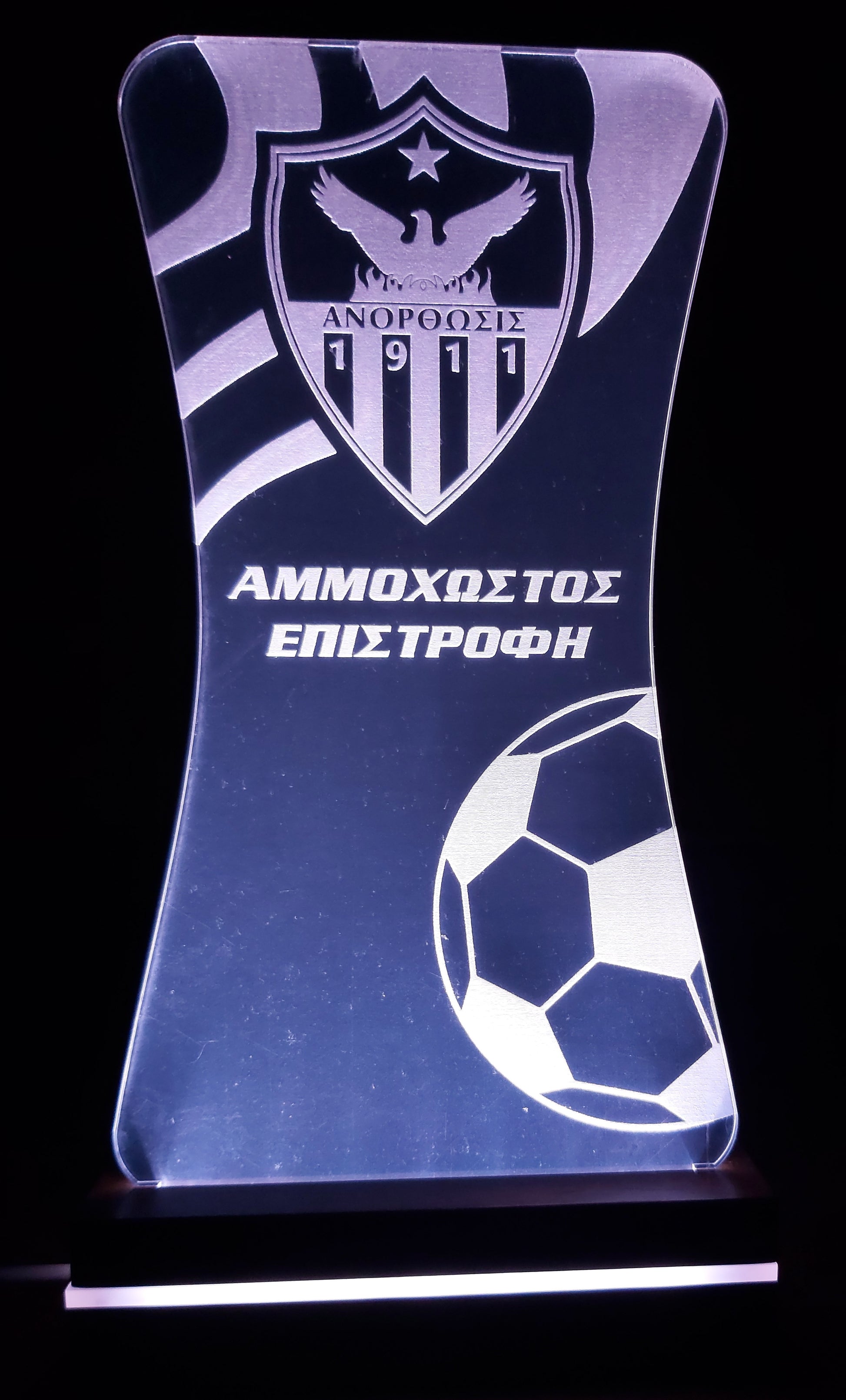 Led lighting made of acrylic, with a soccer ball engraving and the shield of ANORTHOSIS.