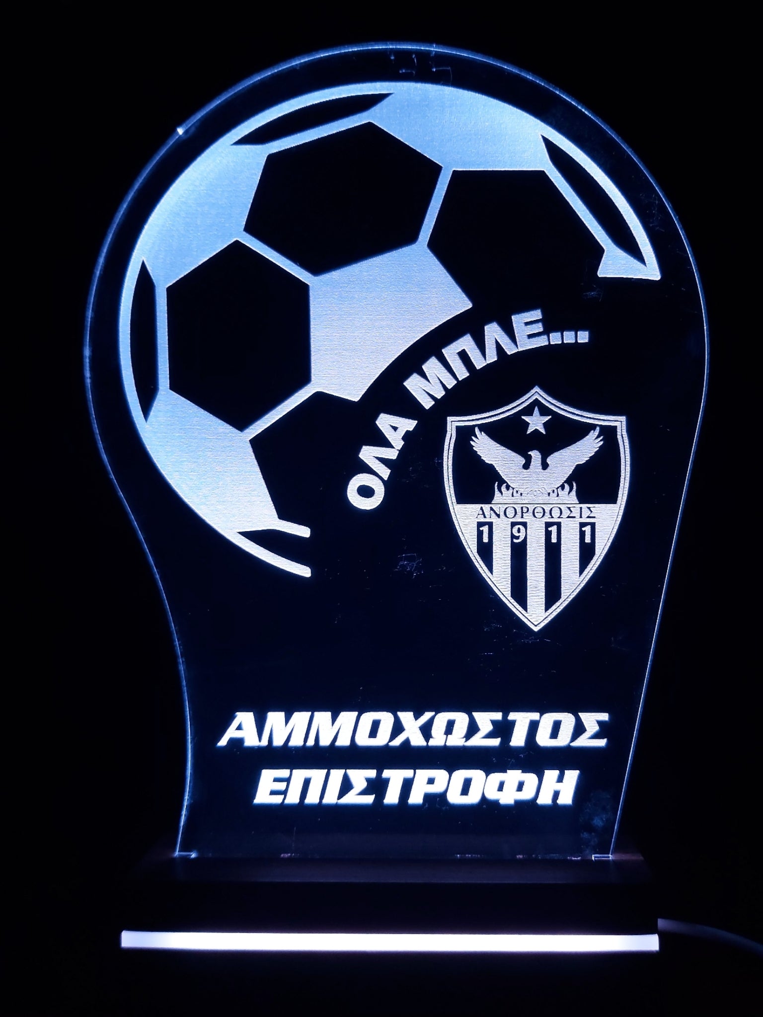 Led lighting made of acrylic, with a soccer ball engraving and the shield of ANORTHOSIS.