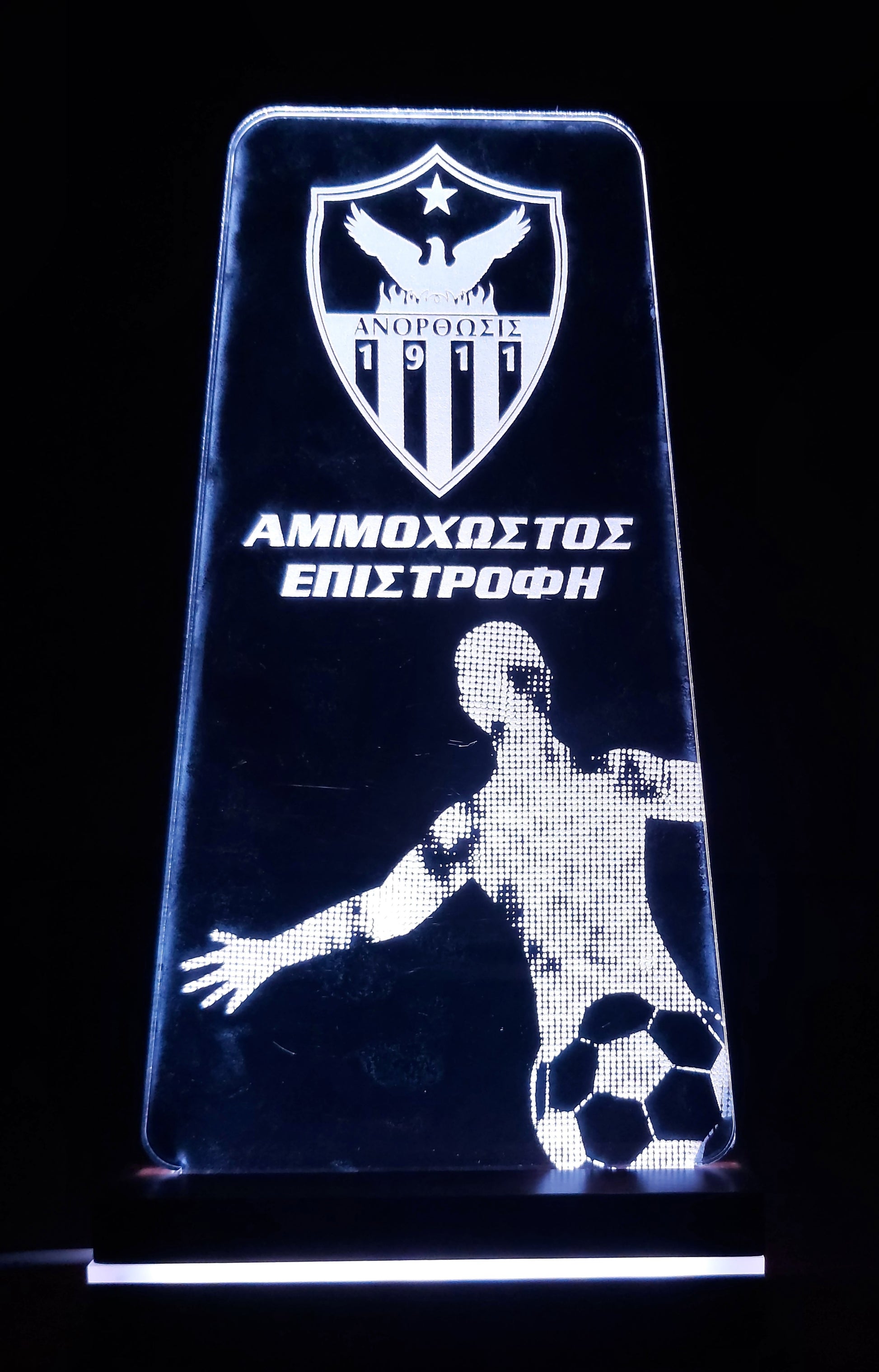 Led lighting made of acrylic, with a football player engraving and the shield of ANORTHOSIS.