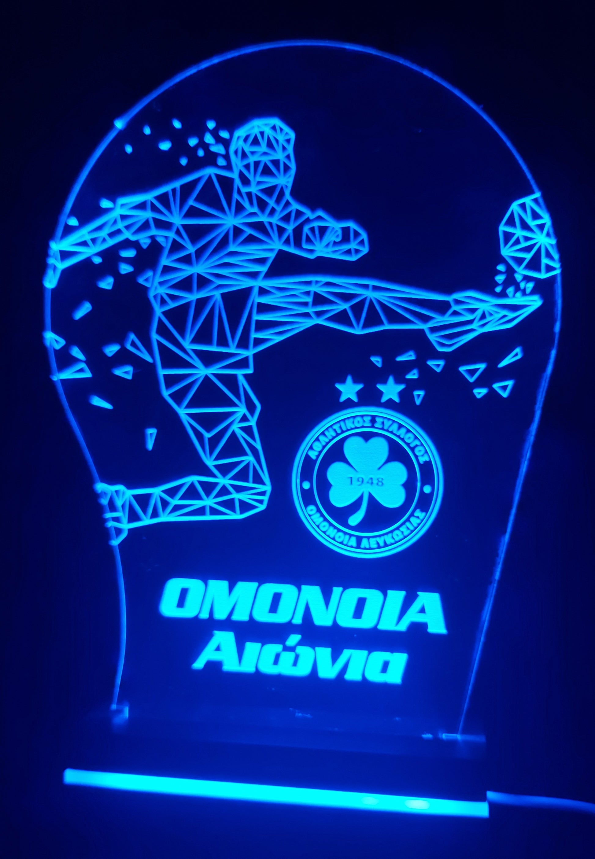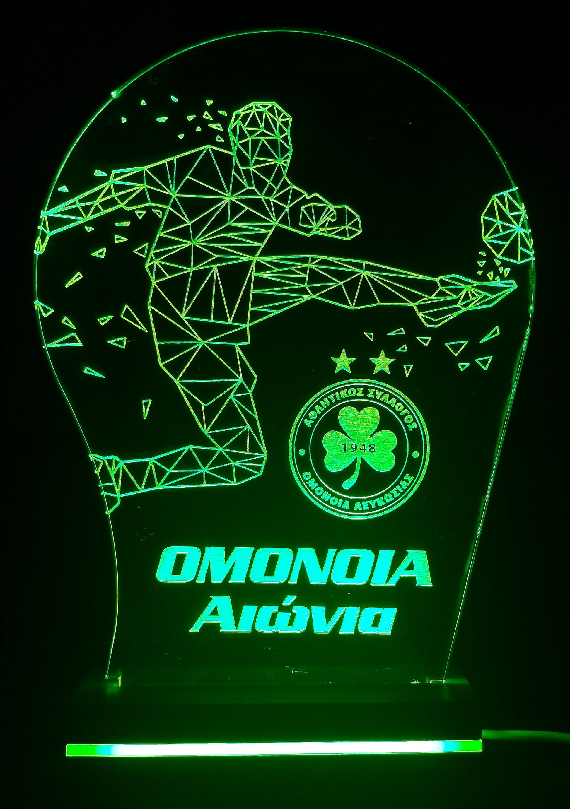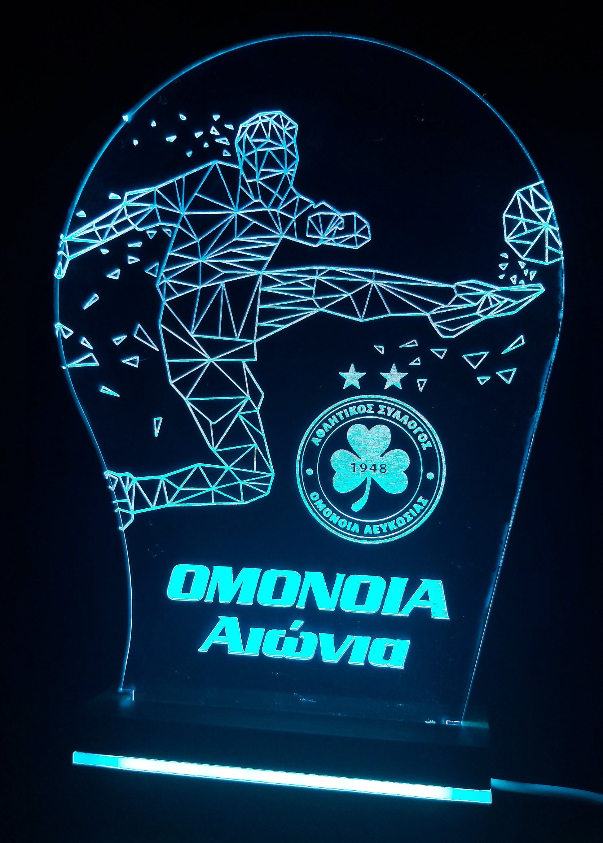 Led lighting made of acrylic, with a football player engraving and the shield of OMONOIA.