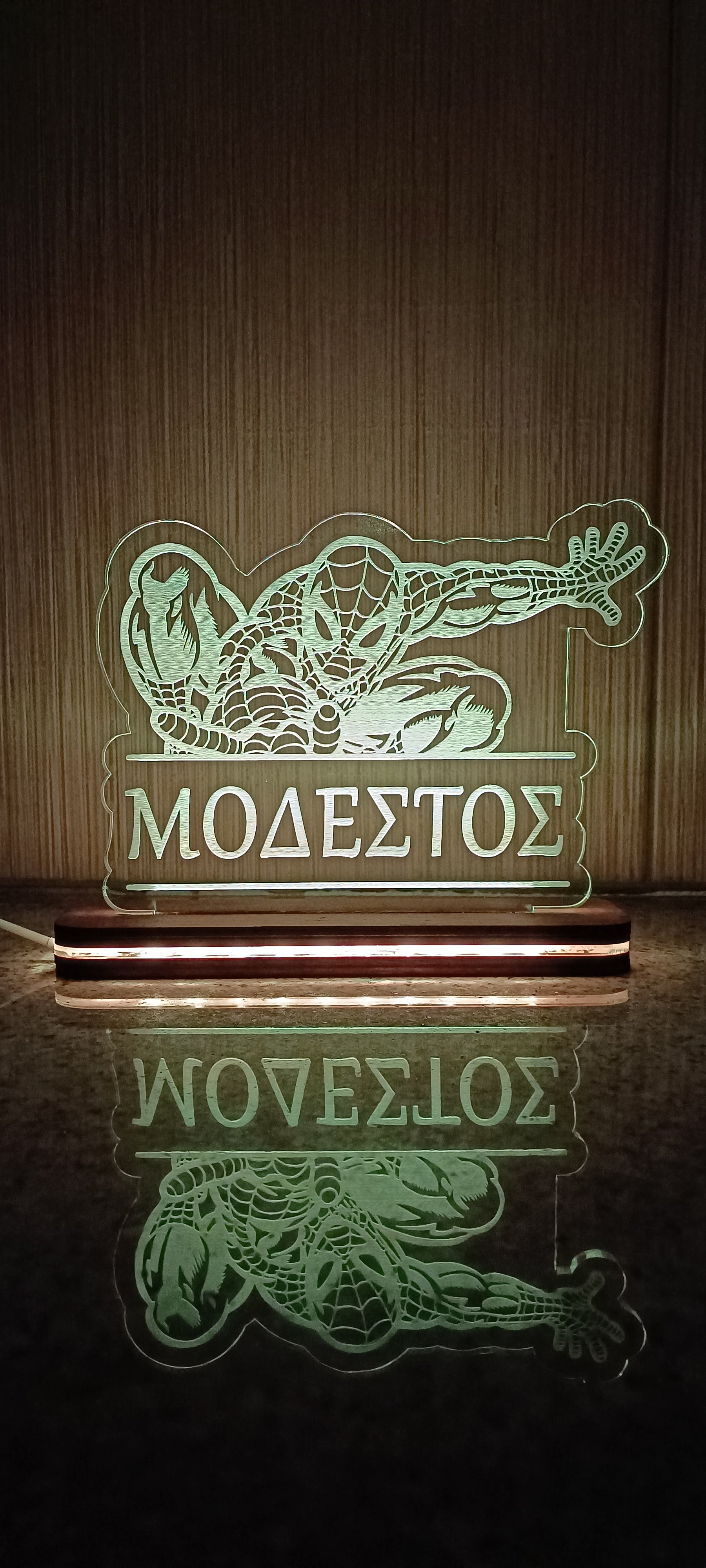 It is accompanied by a wooden handmade base with LED 7 RGB lights, fading and flashing light mode.